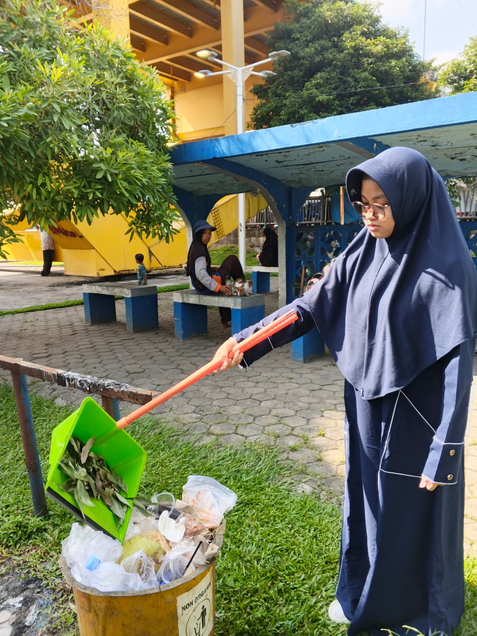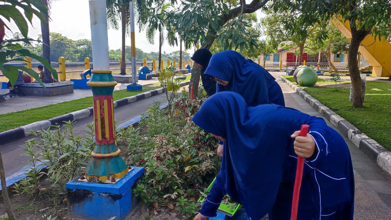 Kegiatan ini melibatkan murid yang melakukan aksi bersih-bersih di area taman dan jalur pejalan kaki dengan memungut serta mengumpulkan sampah di sekitar lokasi.
